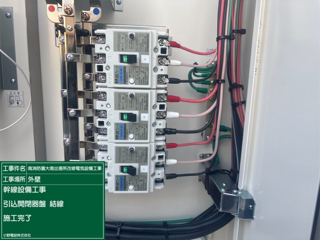 - 消防署にて100SQ幹線ケーブルの結線工事を実施今回は某消防署にて、引込開閉器盤の結線工事を行いました。 今… 続きを読む: 消防署にて100SQ幹線ケーブルの結線工事を実施