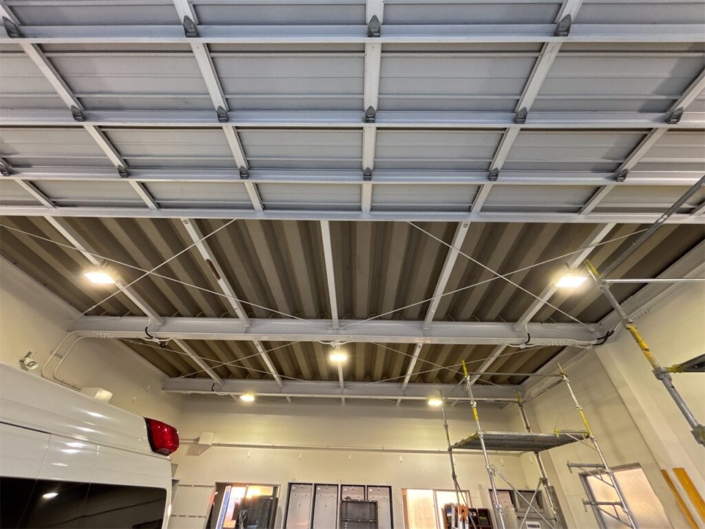 天井の高い車庫内での作業や、動線を確保しながらの施工は緊張感もありましたが、無事に完了。
