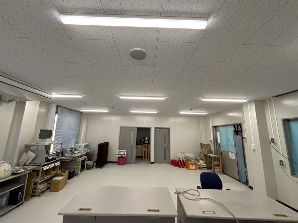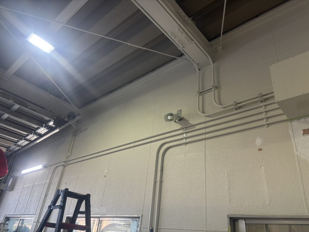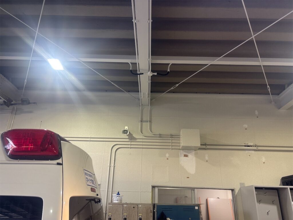 分電盤の新設・配管配線工事から、車庫内の照明更新、事務室のLED化まで、建物全体の電気設備を見直し、安全性と作業性の向上を図りました。